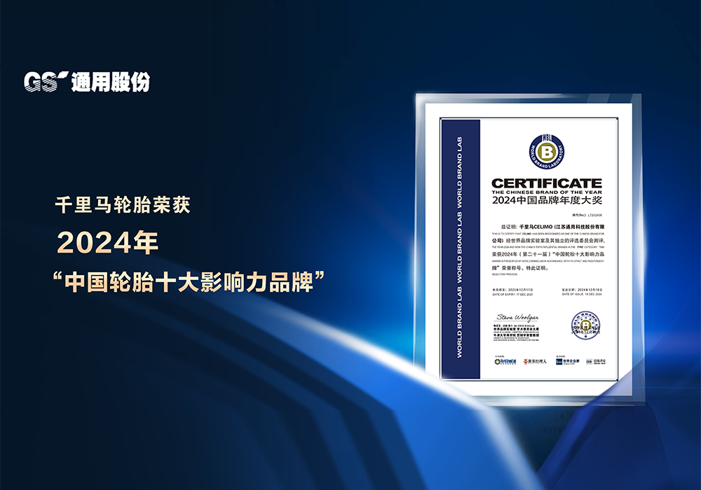 12月18日,通用股份旗下千里馬輪胎連續六年榮獲中國輪胎十大影響力品牌稱號。這項殊榮來自2024年第二十一屆中國品牌年度大獎評選,該獎項由