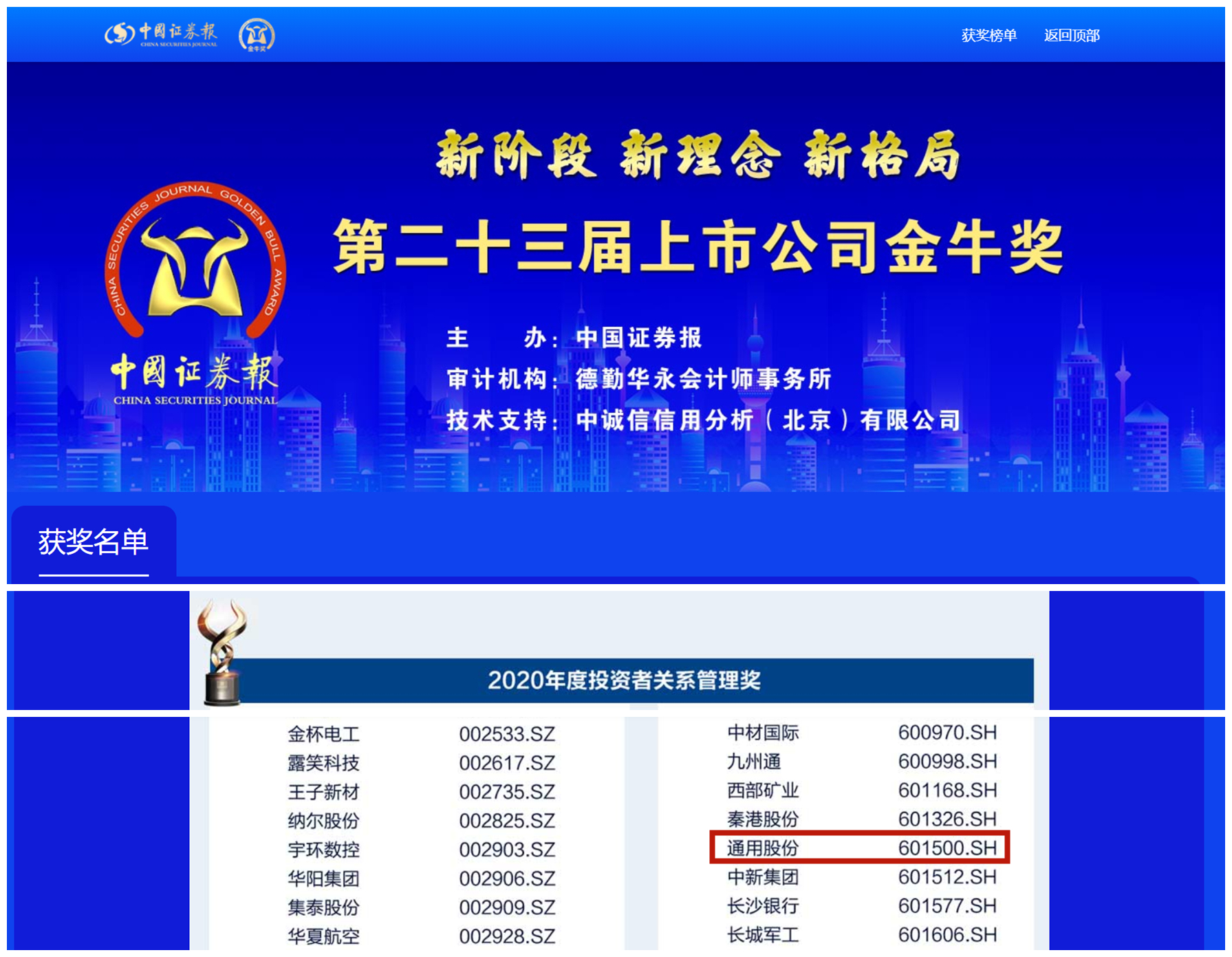 據(jù)了解,金牛獎(jiǎng)是中國(guó)證券報(bào)鼎力打造的金融品牌,旨在公開、公正、公平原則下,表彰上一年度業(yè)績(jī)優(yōu)秀、治理卓越、具有崇高使命和社會(huì)責(zé)任感的上市公司。自1999年創(chuàng)立以來,金牛獎(jiǎng)評(píng)選已至第二十三屆,是中國(guó)資本市場(chǎng)最具影響力的獎(jiǎng)項(xiàng),在中國(guó)資本市場(chǎng)中具有上市公司“奧斯卡”的美譽(yù)。